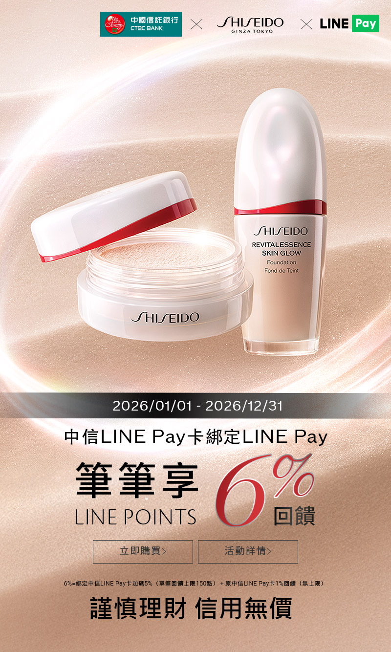 - 綁定中國信託LINE Pay聯名卡並透過LINE Pay支付功能於資生堂集團6品牌官方網站(國際櫃、肌膚之鑰、NARS、watashi+、DE、IPSA)消費,享LINE POINTS 6%回饋。
