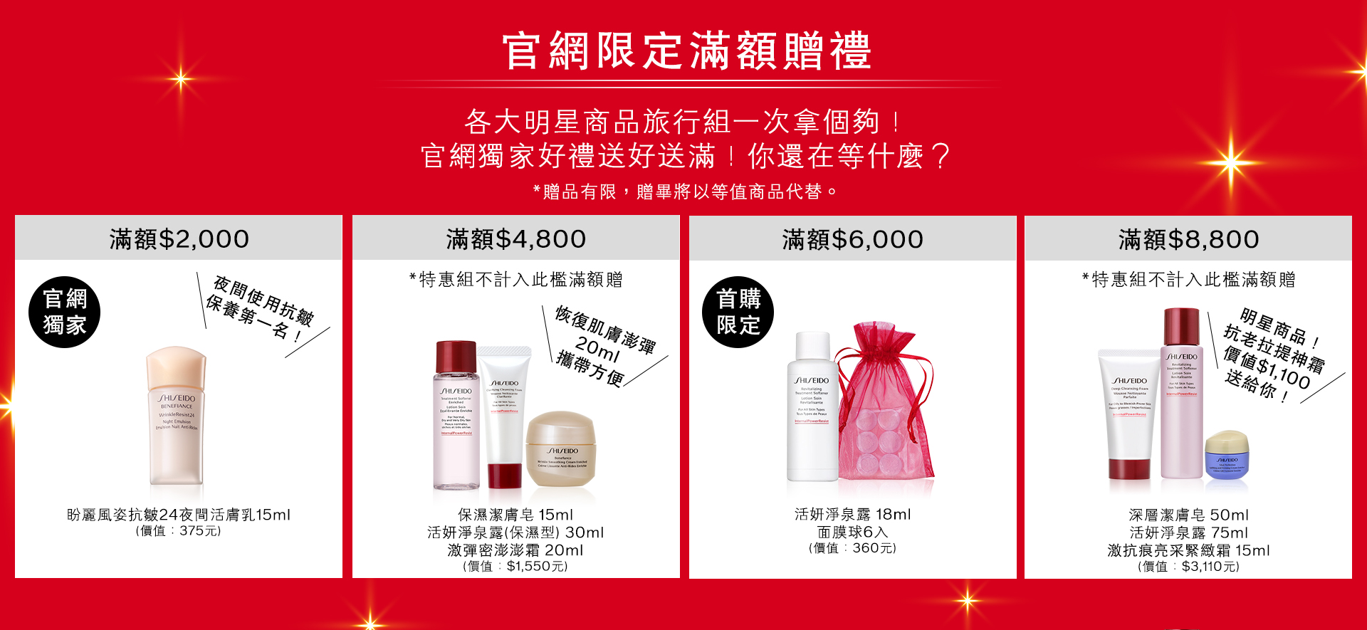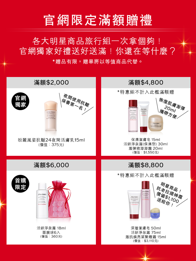 首次於資生堂國際櫃官網購物,單筆訂單滿NT$6,000(折扣後),即可獲得紅妍會員升等禮一份。(贈品將隨訂單出貨)